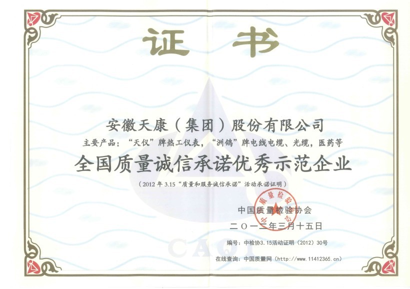全國質(zhì)量誠信承諾示范企業(yè)證書